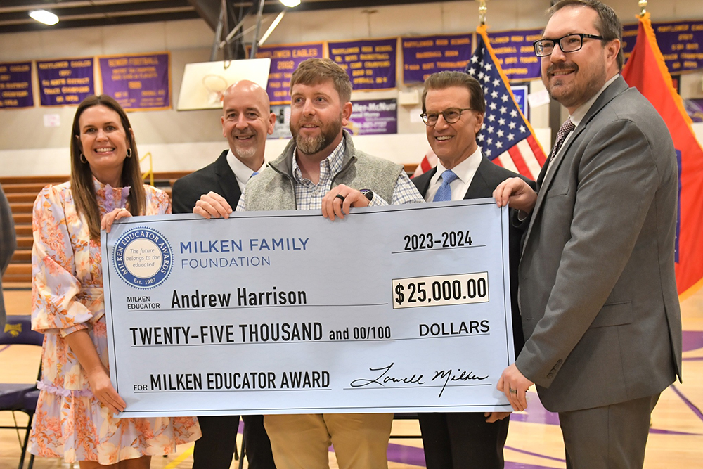 Arkansas Tech University alumni Andrew Harrison and Ashley Anderson Post were presented with a Milken Educator Award during surprise ceremonies at their respective schools on Wednesday, Oct. 4.
