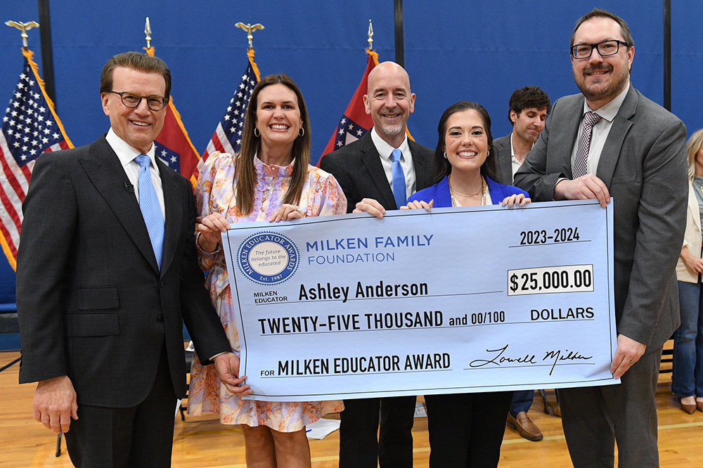 As Milken Educator Award winners, Harrison and Post both receive $25,000. Arkansas Governor Sarah Huckabee Sanders and Arkansas Department of Education Secretary Jacob Oliva visited Mayflower High School and Greenbrier Middle School to present Harrison and Post with their awards during school-wide assemblies.