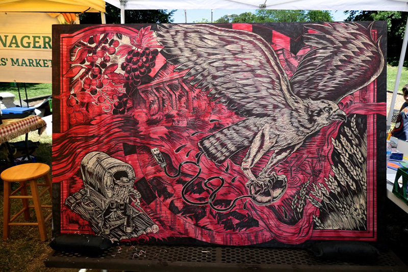 He carved and carved on the 48-inch by 72-inch section of wood, pausing only to toss a dull tool away and replace it with a fresh one. With such a limited time frame, there was no opportunity to stop and sharpen.