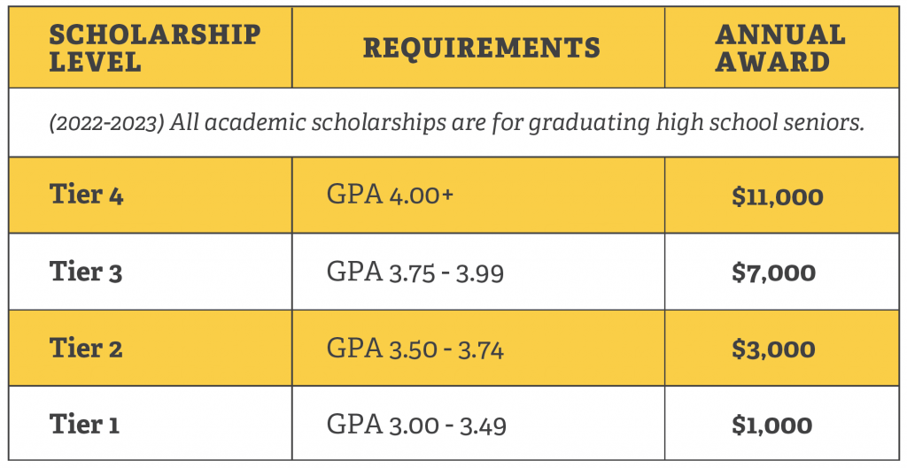 Students who have already accepted their current scholarship award will automatically be adjusted to the new tiers if their scholarship award improves. Students who are eligible for additional scholarship monies and have not yet accepted their scholarship award will receive a new scholarship offer via their personal e-mail. Additionally, students are still eligible to apply for the fall 2022 academic year and be considered for scholarship monies.