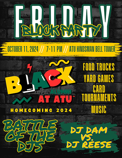 There will be an ATU Black Alumni block party from 7-11 p.m. Friday, Oct. 11, at Hindsman Tower. The event will include food trucks, yard games, card tournaments and music.