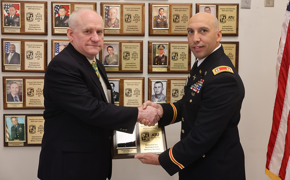 Retired Lt. Col. Stephen W. White was inducted into the Arkansas Tech University U.S. Army ROTC Hall of Honor during an ATU Homecoming weekend ceremony on Saturday, Oct. 25, at Doc Bryan Student Services Center Rotunda.
