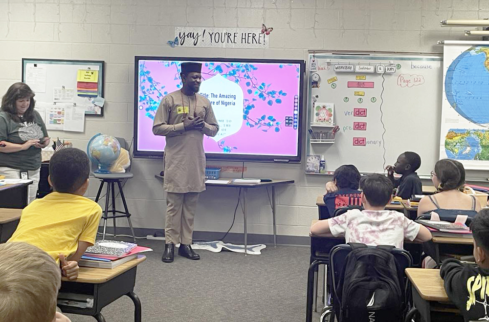 The outreach included the ATU international students saying hello to Russellville Intermediate School students in their native languages during morning drop-off and making classroom presentations. At Crawford Elementary, ATU international students made presentations about their homelands during a family cultural night.