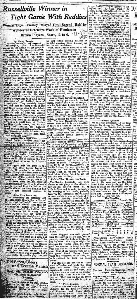 The first, on Nov. 14, 1920, described the Russellville Aggies as “the wonder team of the 1920 football drama in Arkansas.”