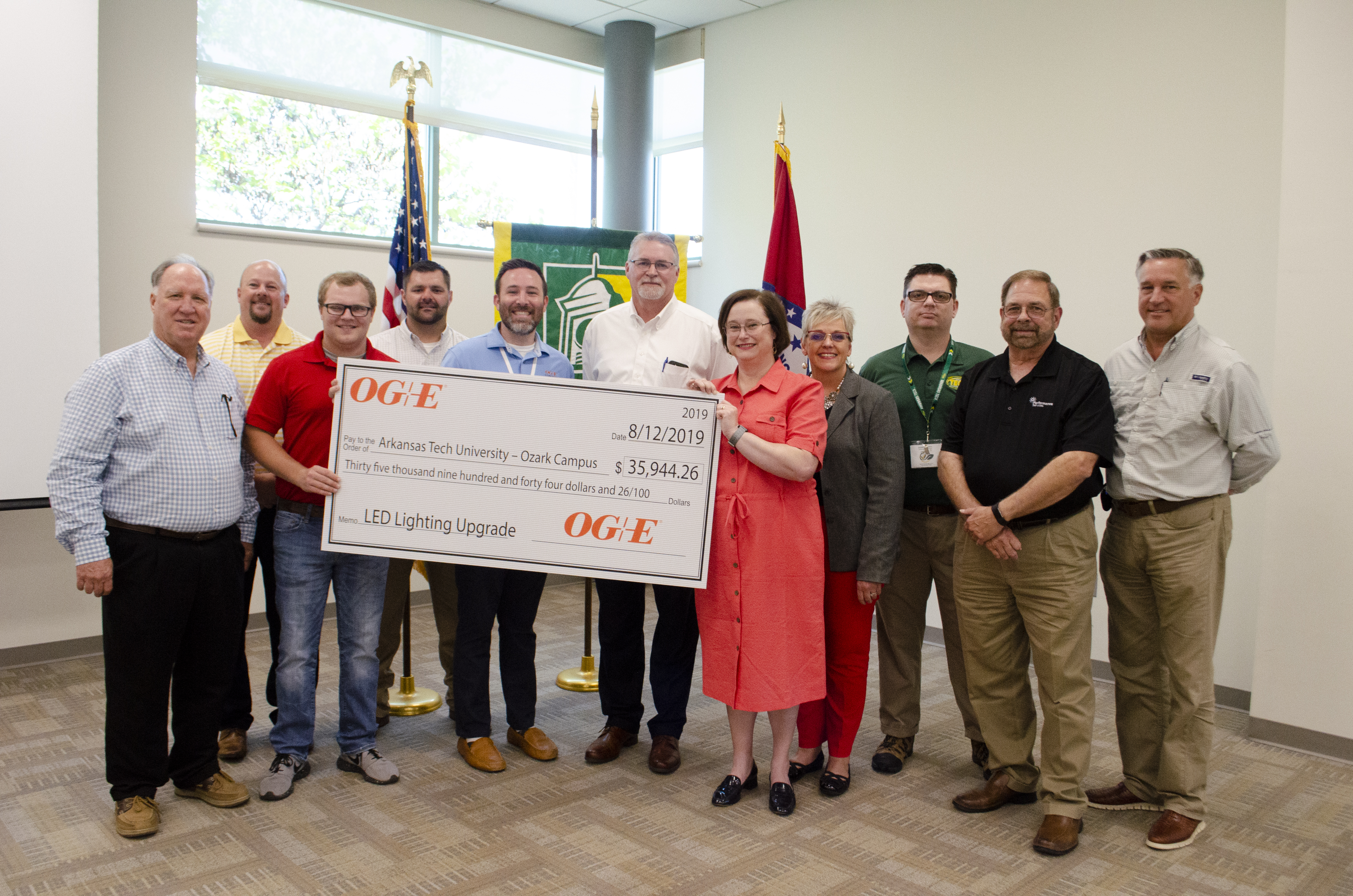 OG&E presented a check to Arkansas Tech University-Ozark Campus on August 12, 2019, for $35, 944.26 as part of an energy-saving initiative.
