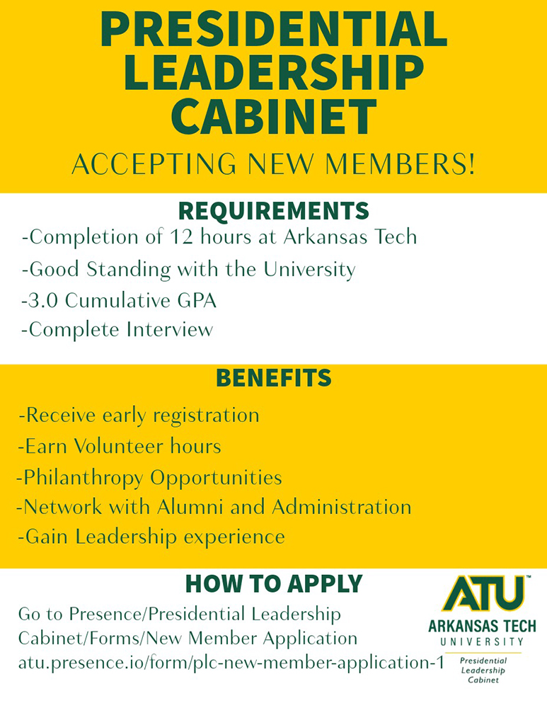 Eligible Arkansas Tech University students with an interest in serving on the ATU Presidential Leadership Cabinet during the 2026-27 academic year are encouraged to complete an application.