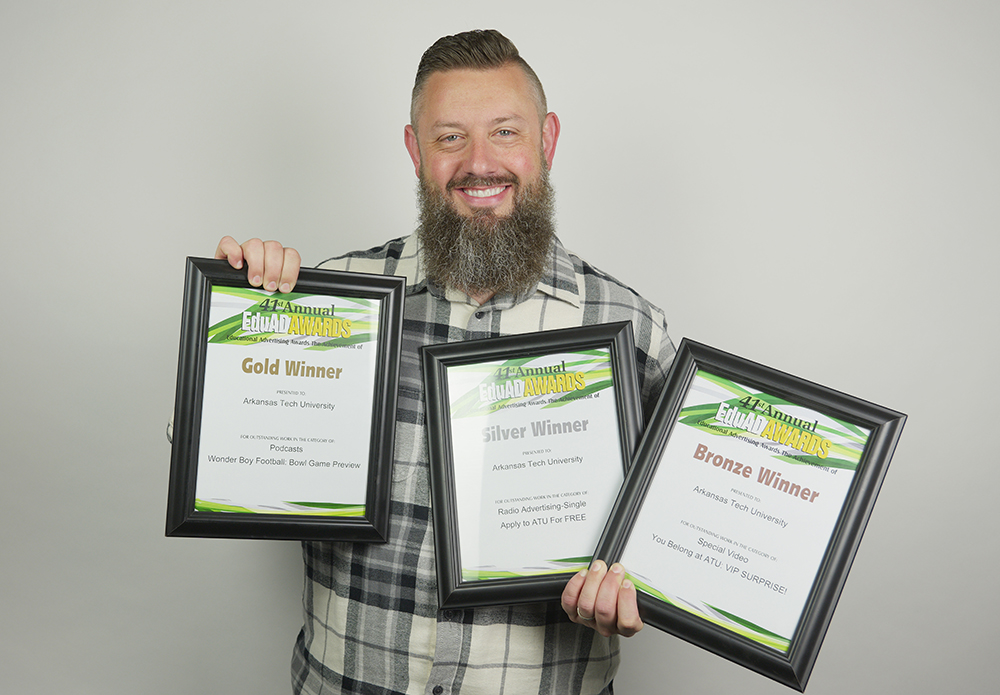 He received a Silver award for a radio advertisement encouraging prospective students to apply to ATU, and he collected a bronze commendation in the special video category for a piece entitled “You Belong at ATU: VIP Surprise.”