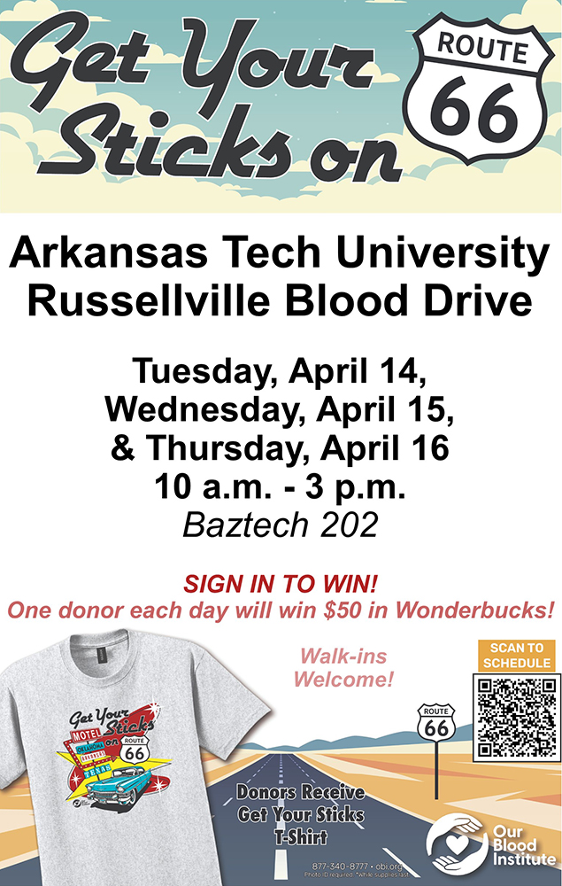 Our Blood Institute will host a blood drive at Arkansas Tech University Tuesday, April 14, through Thursday, April 16.