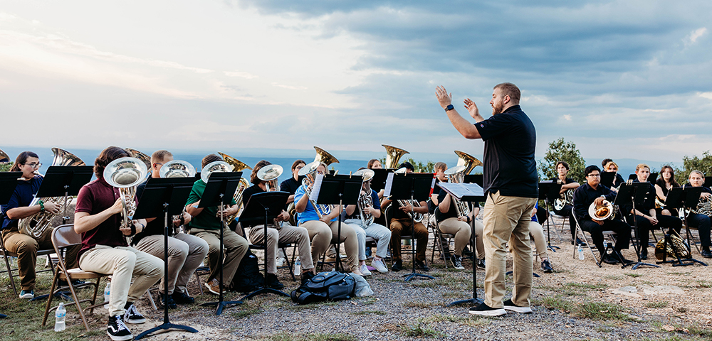 “Back when the Summit Park Hotel was a popular spot in the 1880s and 1890s, the employees of the hotel would go to Sunset Point and perform for the guests of the hotel at dusk,” said Scott Waniewski, Mount Nebo State Park superintendent. “We wanted to try to incorporate a modern program with the history of the park, and (Brass in the Clouds) has been going on now since 2005. It has developed over the years, and it’s a wonderful experience for anyone who wants to enjoy Arkansas Tech’s brass musicians and watch sunset on Mount Nebo.”