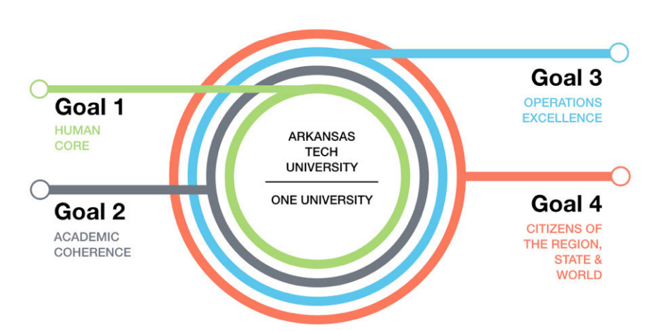 A graphic displaying the 4 goals: Human Core, Operations Excellence, Academic Coherence and Citizens of the Region, State & World