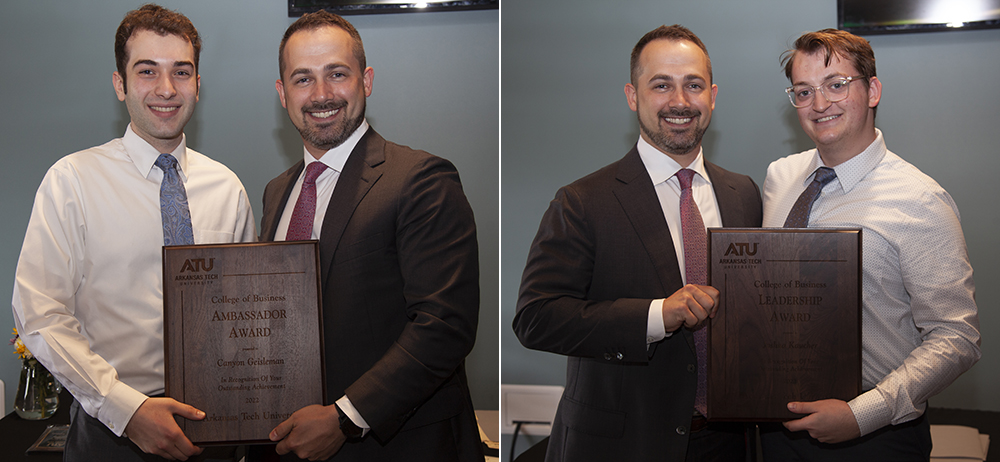 Canyon Geisleman and Joshua Kaucher received the top two annual student awards presented by the Arkansas Tech University College of Business during an awards reception at Williamson Hall Dining Room on Thursday, April 21.