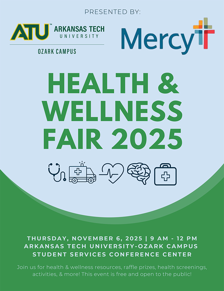 Arkansas Tech University–Ozark Campus and Mercy Hospital Ozark will host a health and wellness fair from 9 a.m.-noon Thursday, Nov. 6, in the ATU-Ozark Student Services Conference Center.