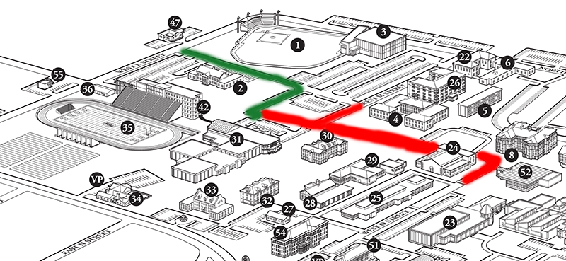 Individuals planning to access the Green and Gold parking lot near the Hull Physical Education Building and handicap accessible parking should plan on accessing those lots by way of North Fargo Avenue. This pathway is indicated in green on the map above.