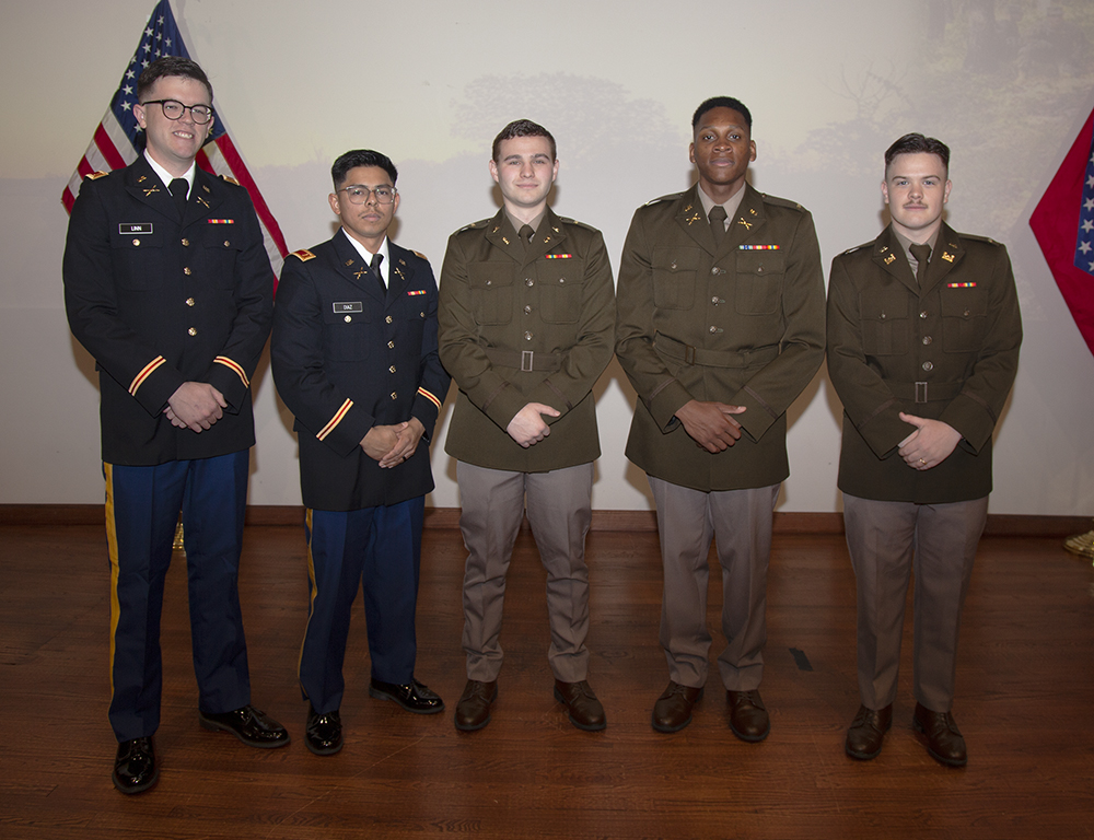 Jorge Diaz of Green Forest, Andrew Harris of Cabot, John Linn of Little Rock, Khamian Riley of Benton and Addison Wooten of Dover received their gold bars before an audience of family, friends and U.S. Army ROTC cadets.