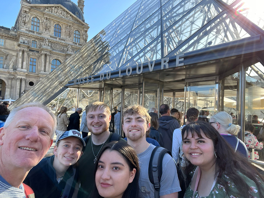 Philippe Y. Van Houtte (left) and the Arkansas Tech University students who visited France in early 2025 outside the Louvre.