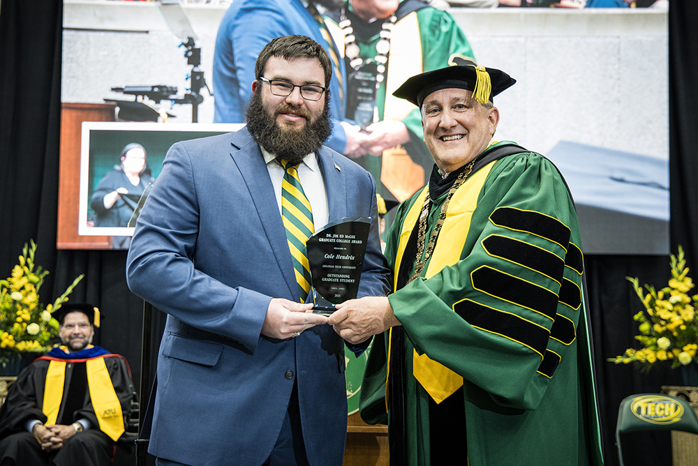 Hendrix is the 2025 recipient of the Jim Ed McGee Award for ATU outstanding graduate student. He was recognized during ATU spring commencement on Saturday, May 10, at Tucker Coliseum.