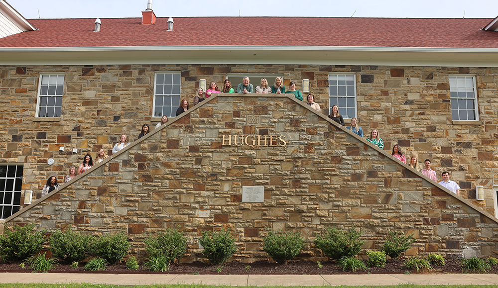 Dr. Russell Jones, Arkansas Tech University president, and Suzanne McCall, ATU vice president for administration and finance, joined the staff members who will work in Hughes Hall for a group photo celebrating the re-opening of the renovated facility.