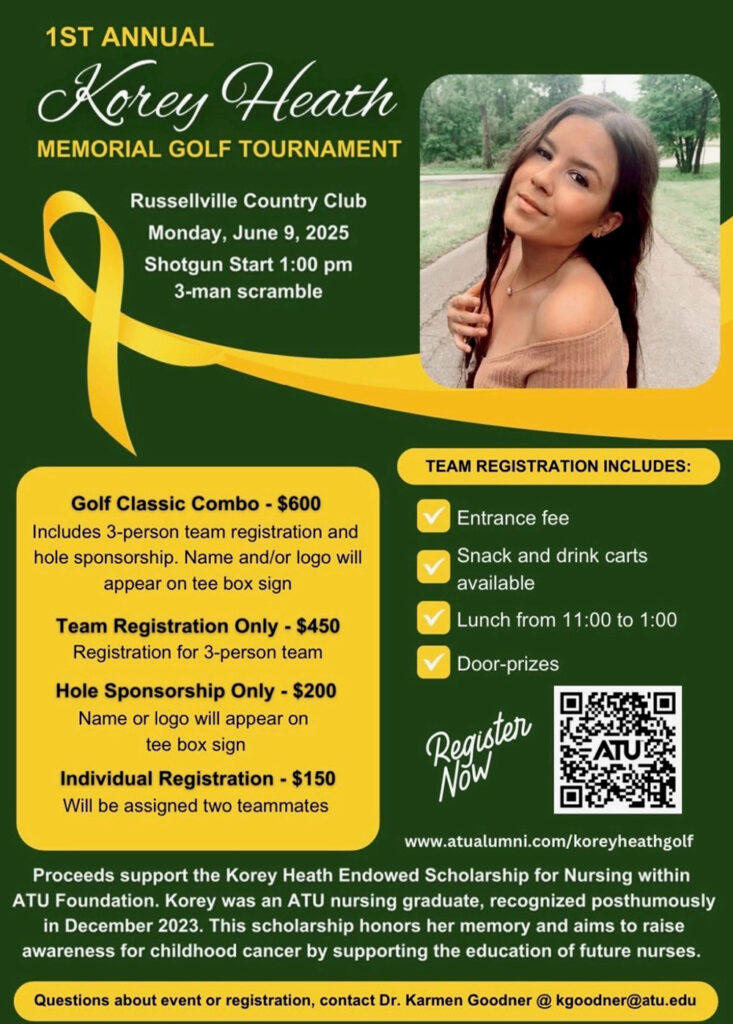 The inaugural Korey Heath Memorial Golf Tournament is scheduled for Monday, June 9, at Russellville Country Club. Registration for the three-person scramble is $150 per player. Hole sponsorships are available for $200. Full details are available on the flyer below.