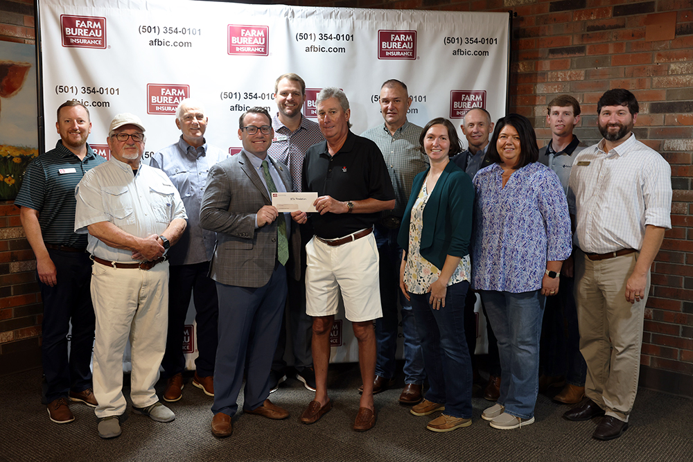 Scott McKennon, secretary and treasurer for Conway County Farm Bureau, presented a check to Jason Geiken, ATU vice president for advancement and executive director of the ATU Foundation, during a gathering at the Farm Bureau Insurance location in Morrilton on Wednesday, July 17.