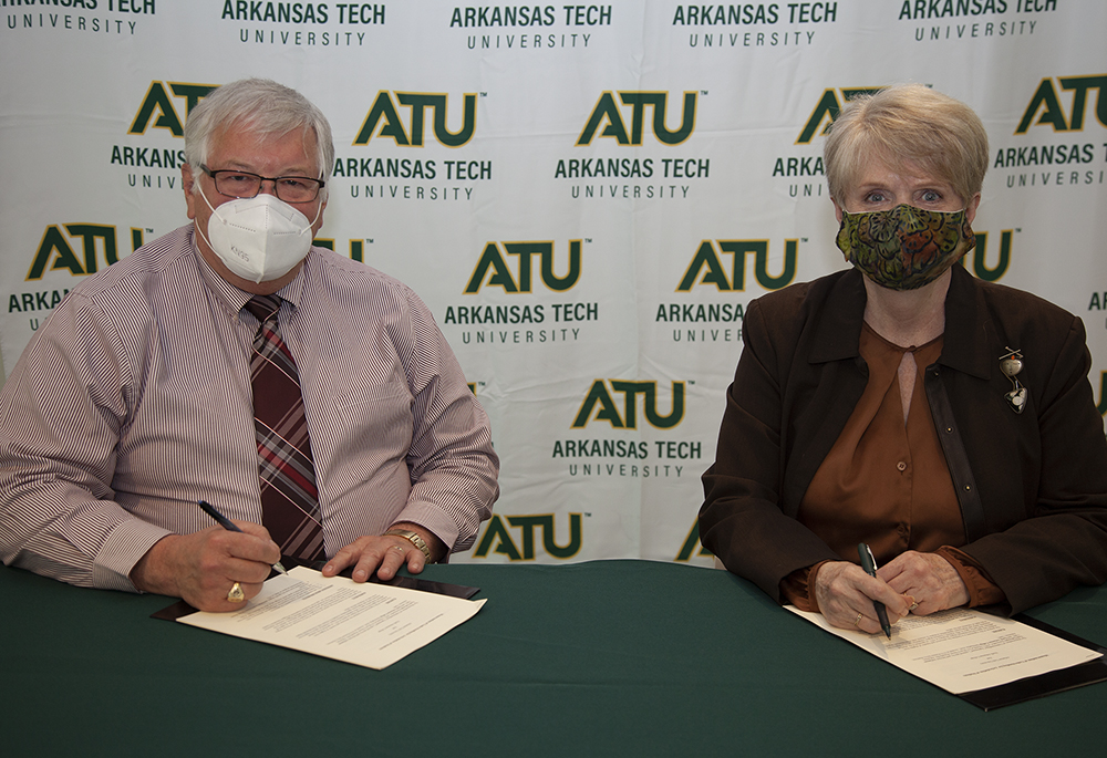 Arkansas Tech University and North Arkansas College signed an articulation agreement on Wednesday, Oct. 6, that will assure a smooth transition to specified baccalaureate degree programs at ATU for graduates from NAC.