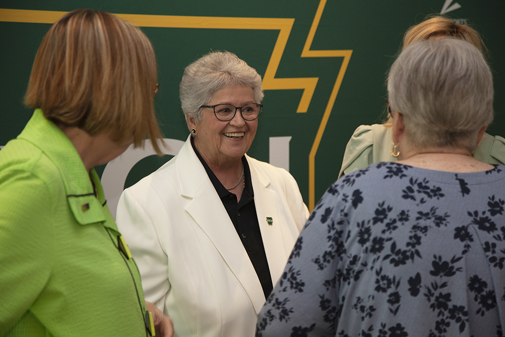 File photo of Dr. Mary B. Gunter visiting with friends and colleagues at her retirement reception in 2023.