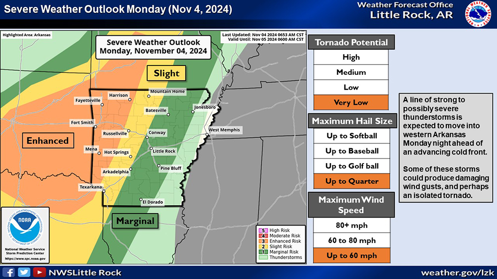 The National Weather Service has notified the public that severe thunderstorms are likely in Arkansas during the afternoon and evening hours on Monday, Nov. 4.