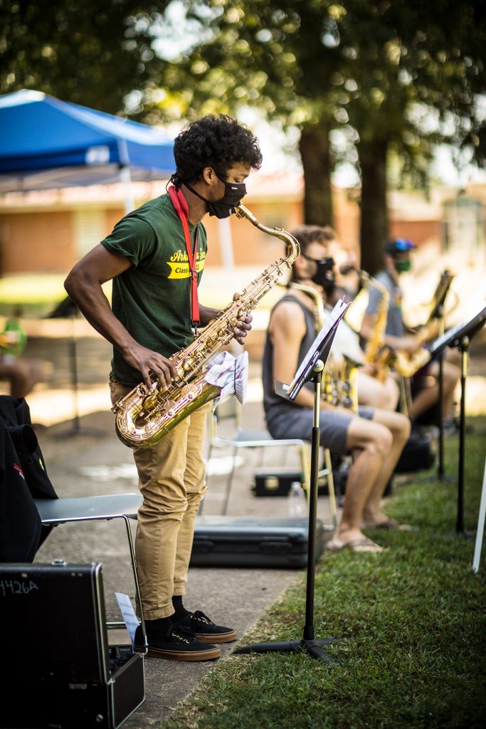 Numbering over 200 members, Arkansas’ Band of Distinction was destined to look, perform and interact differently in the Fall 2020 semester and Barker played an important role in the ensemble’s success. Aside from his leadership as a teaching assistant on the field, he took on the responsibility of recording audio of each section as they rehearsed outdoors.