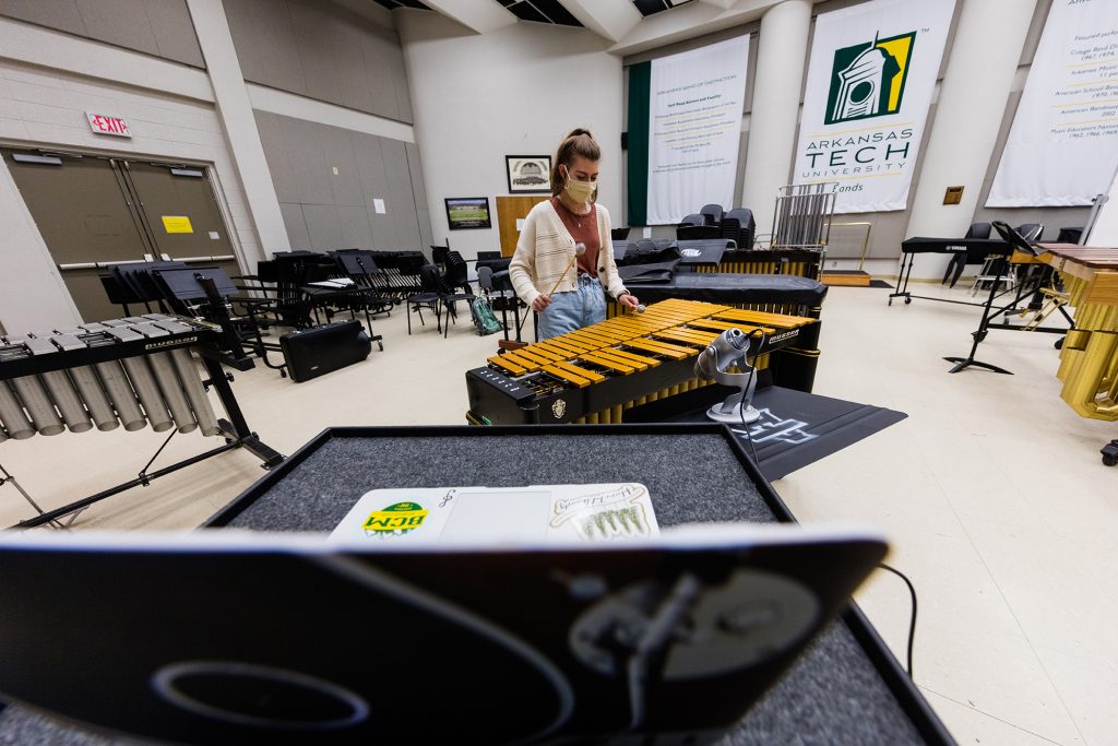 Barker is involved in jazz ensemble, marching band and symphonic wind ensemble (the top tier concert instrumental ensemble at ATU.) Aside from the instrumental talents that brought him to the university, he’s got a knack for composition. That experience as a composer and his in-depth knowledge of the software that accompanies that skillset is what has made him an invaluable member of the instrumental music department’s success this fall semester.