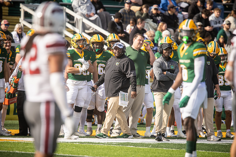 In his first year as Arkansas Tech University head football coach, Roy Thompson (center) has led the Wonder Boys to their first winning season and their first postseason appearance since 2017. Photo by Liz Chrisman.