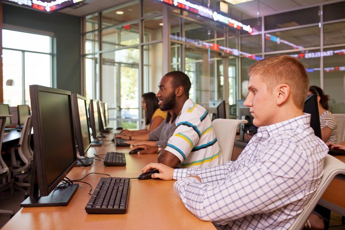 Much like this shot from a business classroom in 1955 that was captioned as a space “to provide professional training for young men and women seeking positions in business teaching, and to enable them after graduation to advance more rapidly in their chosen fields,” the John & Joie Nutt Trading Lab in Rothwell Hall does just the same in 2018. Students in the Economics & Finance division of the College of Business benefit from the live ticker tape broadcasting the latest reports from the New York Stock Exchange.