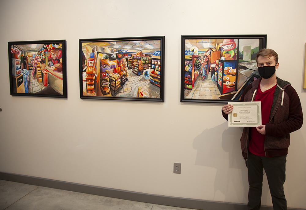 A senior fine arts major, Whitlock captured first place with his submission of an acrylic painting on canvas entitled “Freakstop.” It depicts the artist’s imaginative view of a convenience store filled with colorful characters.