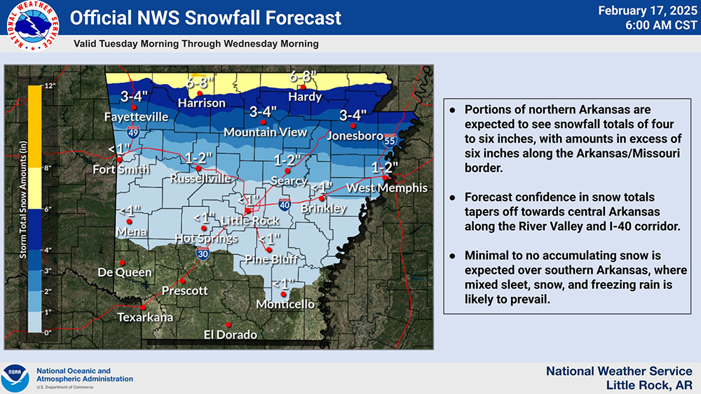 The National Weather Service office in Little Rock is predicting that frozen precipitation will fall on the region that includes Arkansas Tech University campuses in Russellville and Ozark this week, possibly beginning during the daylight hours on Tuesday, Feb. 18.