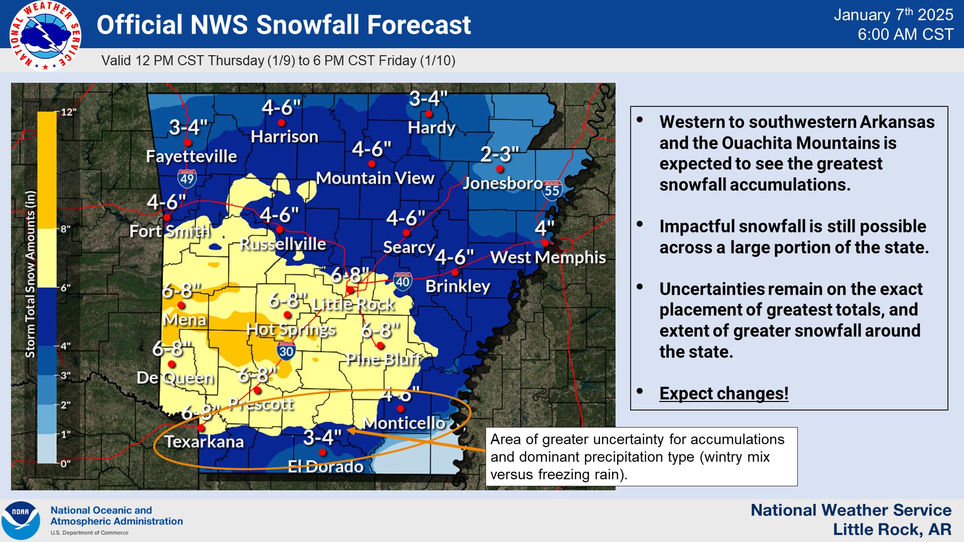 The National Weather Service office in Little Rock is predicting that a moderately impactful snowfall will fall on the region that includes Arkansas Tech University campuses in Russellville and Ozark, possibly beginning as early as the afternoon hours on Thursday, Jan. 9, and continuing through much of Friday, Jan. 10.